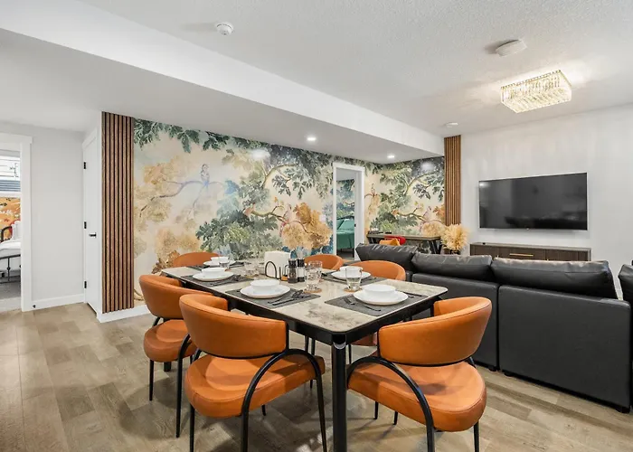 Situated about a 10-minute ride from oasis greens Golf Driving Range centre, the 1000 m² King Bed, Full Kitchen, Free Parking, Family Friendly Dining, Workspace & Fast Wi-Fi - Private Basement Suite Calgary also boasts easy access to Downtown- West Kerby C train station which is 29 km away.